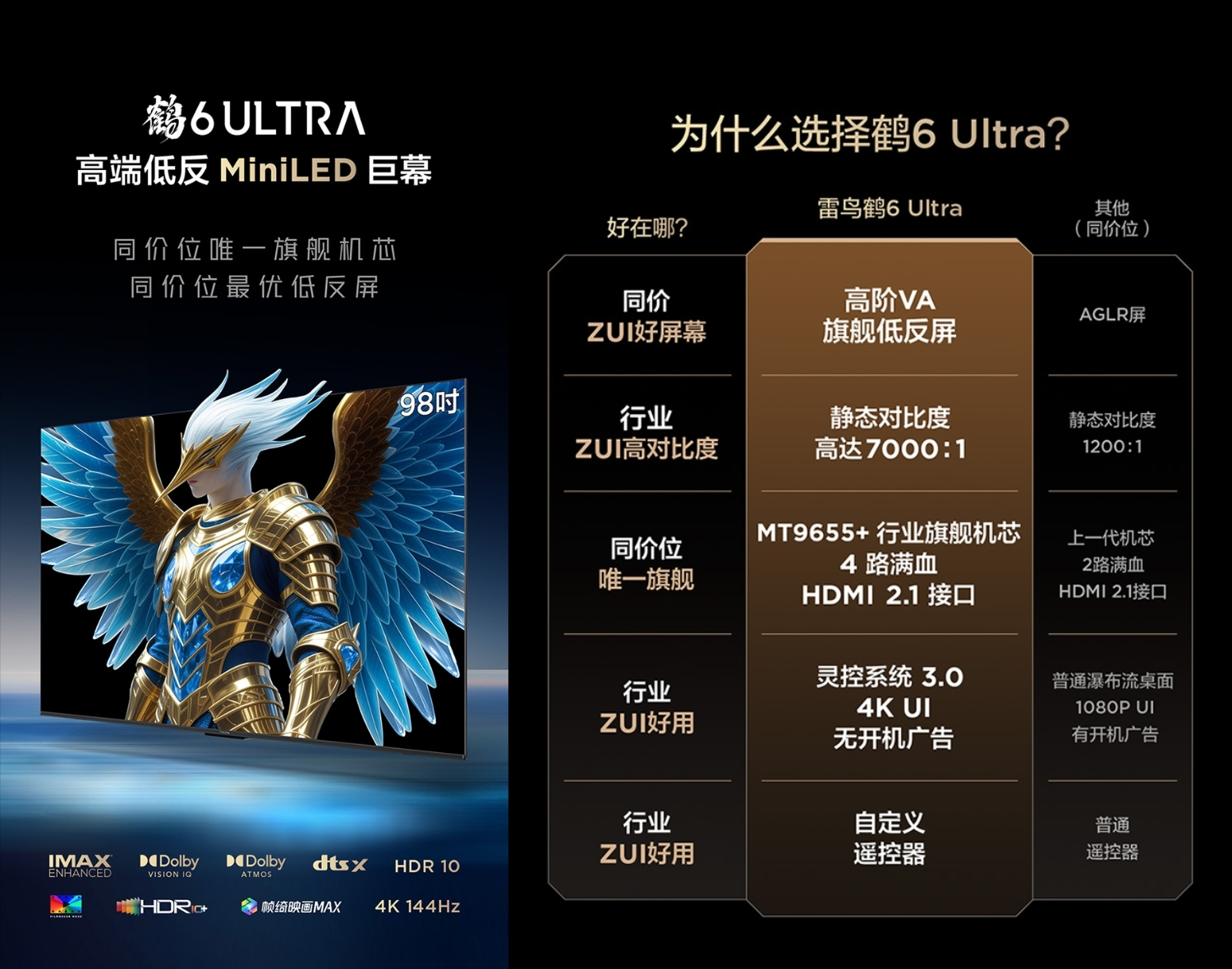 周末午后的客厅,阳光透过落地窗洒在电视屏幕上——这是无数家庭的真实观影场景,也是传统电视的"噩梦时刻"。普通IPS屏1200:1的对比度在强光下会让暗部细节彻底丢失,而雷鸟鹤6 Ultra搭载行业同价位最好的屏幕——华星高阶HVA/VA旗舰低反屏,其7000:1的静态对比度不仅达到了行业最高水准,更创造了同价位段难以逾越的画质基准。