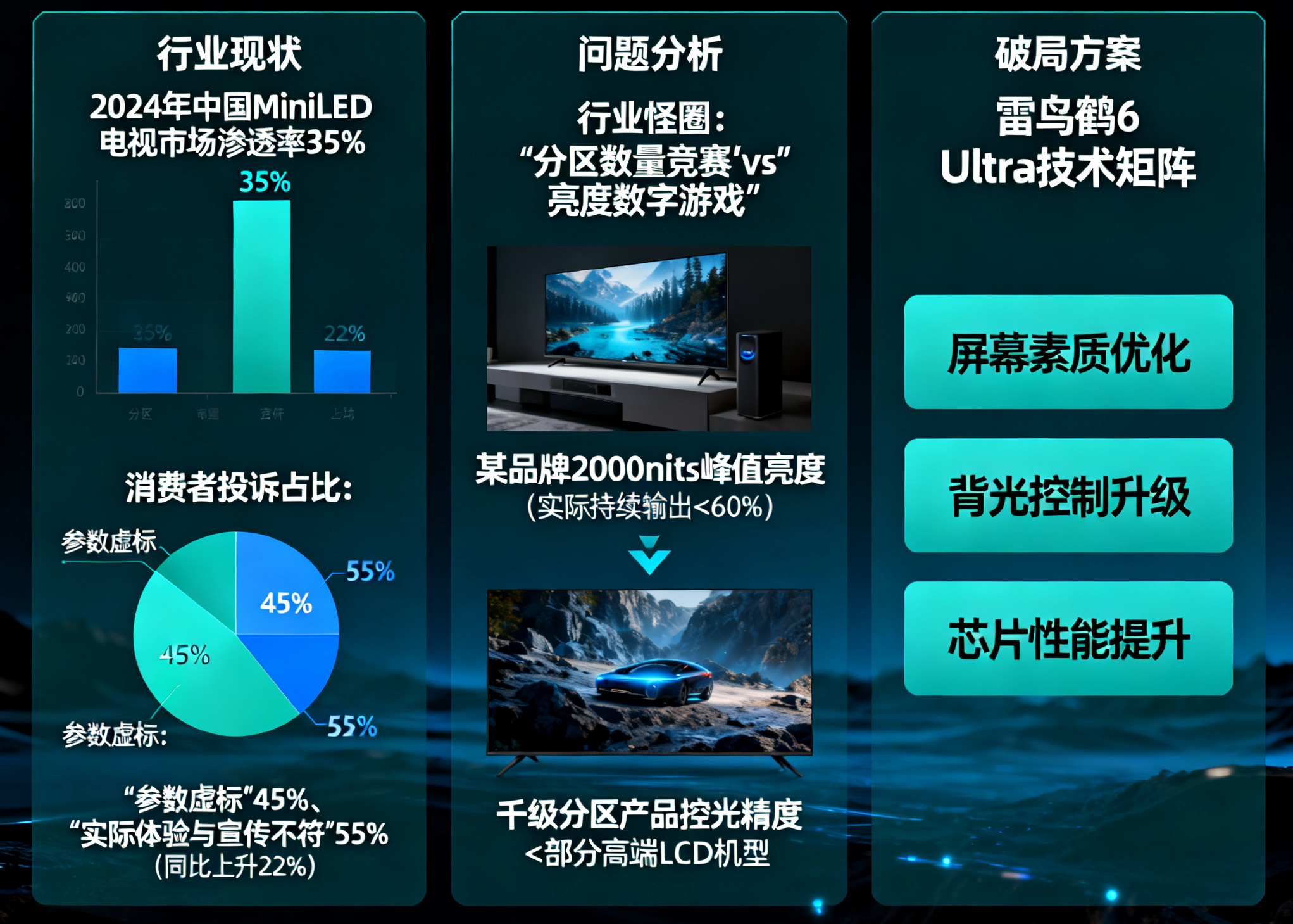 电视行业正在经历一场静默的革命。奥维云网数据显示,2024年中国MiniLED电视市场渗透率已突破35%,但消费者投诉中"参数虚标""实际体验与宣传不符"的占比同比上升22%。这种矛盾背后,是行业长期陷入"分区数量竞赛""亮度数字游戏"的怪圈。