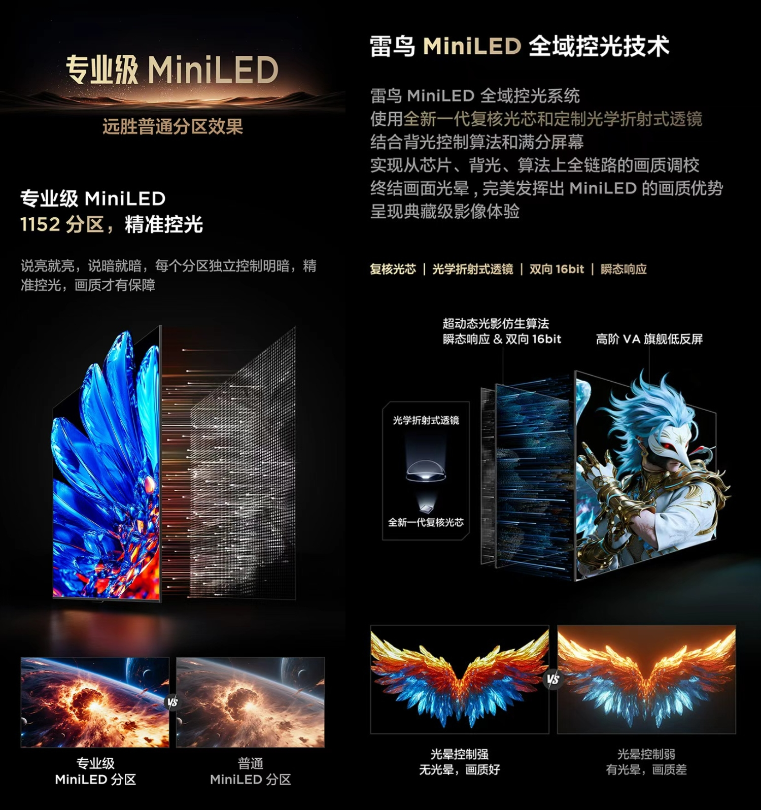 MiniLED的核心价值从来不是分区数量的多少,而是对光线的精准驾驭。以雷鸟鹤6 Ultra 98英寸版本为例,1152分区MiniLED配合全域控光技术,远胜普通分区效果。在2000万:1动态对比度和XDR 2000nits峰值亮度的硬件基础上,实现了"持久稳定"的画质输出。专业级的MiniLED背后是技术的有力支撑:全新一代复核光芯,亮度提升53.8%;光学折射式透镜,控光能力提升96%;双向16bit,瞬态响应。