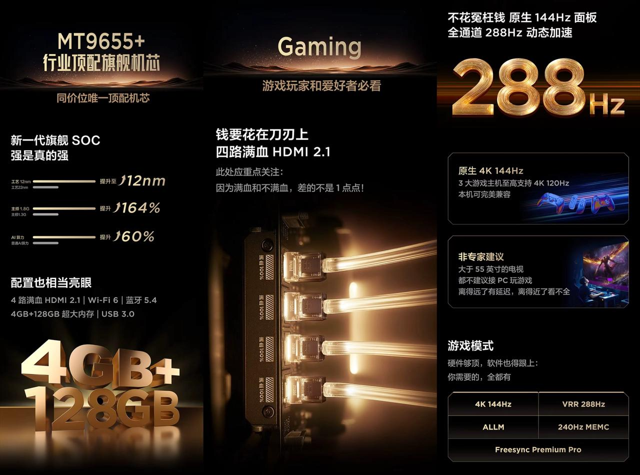MT9655是MediaTek针对高端市场推出的一款高性能处理器。它采用先进的12nm制程工艺,相较于前代产品,在能耗、发热和性能上实现了显著提升——CPU性能提升164%与AI算力提升60%的硬件基础,让画质算法有了施展的舞台。在实际测试中,即使同时开启4K分辨率、HDR解码和MEMC运动补偿,系统依然流畅无卡顿,称得上同价唯一旗舰机芯。