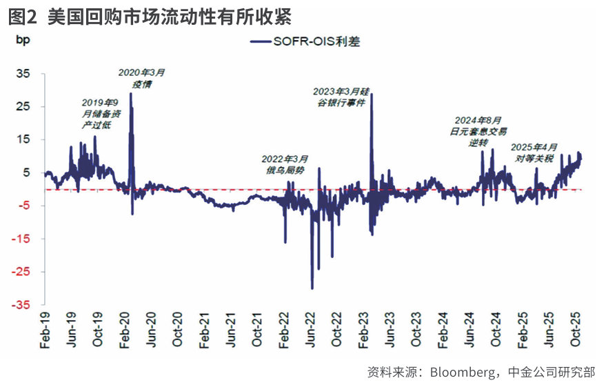 美联储宣布自12月起停止缩表,标志着自2022年6月启动的量化紧缩在三年半后正式告一段落。中国银河证券认为,此次美联储暂停缩表是对近期货币市场流动性迅速收紧的一种回应。10月中旬,隔夜回购利率一度飙升至6%,逆回购池余额锐减至不足3000亿美元,银行体系准备金跌破3万亿美元的“警戒线”,短端资金市场出现明显挤兑迹象。与此同时,财政部发债与TGA账户吸金进一步放大了流动性紧张。暂停缩表本质上是“被动稳流动性”的防风险操作,以防2019年式的回购市场失序重演。